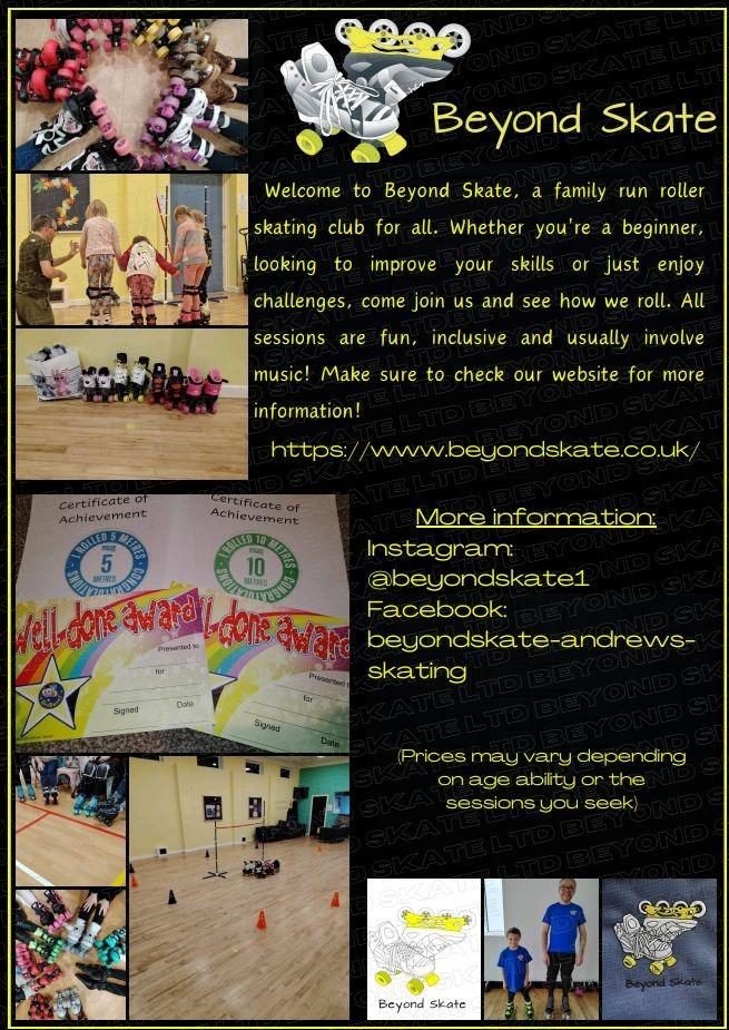Welcome to Beyond Skate, a family run Roller Skating group for all. Whether you're a beginner, looking to improve your skills or just enjoy challenges, come join us and see how we roll. All sessions are fun, inclusive and usually involve music!